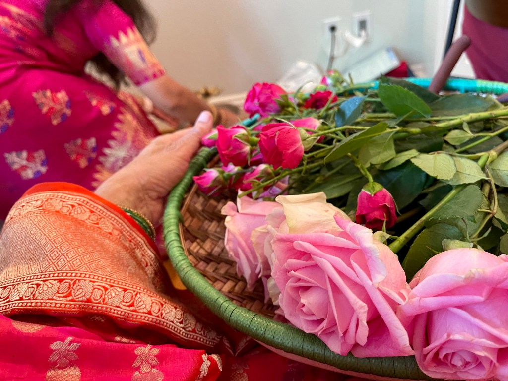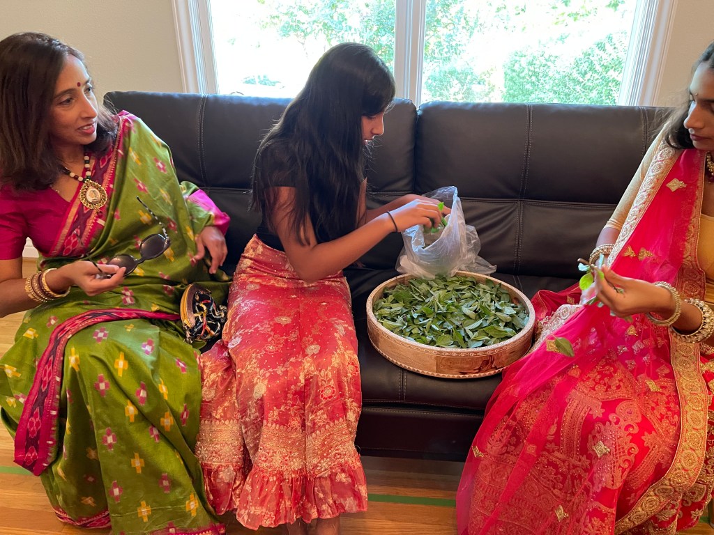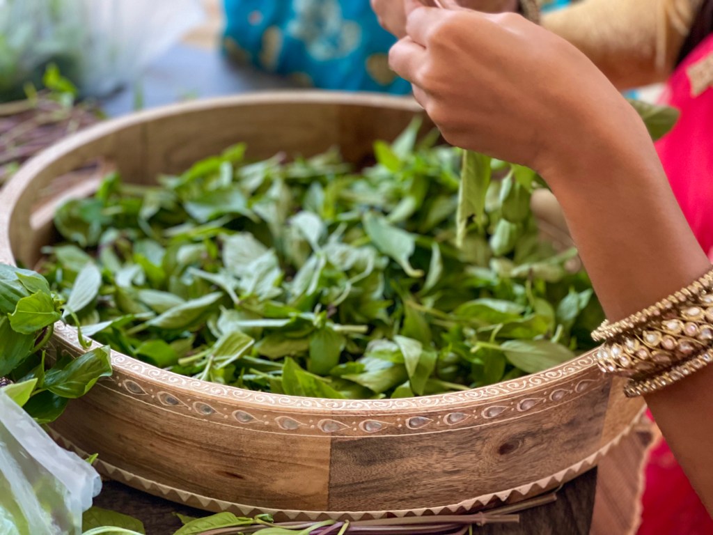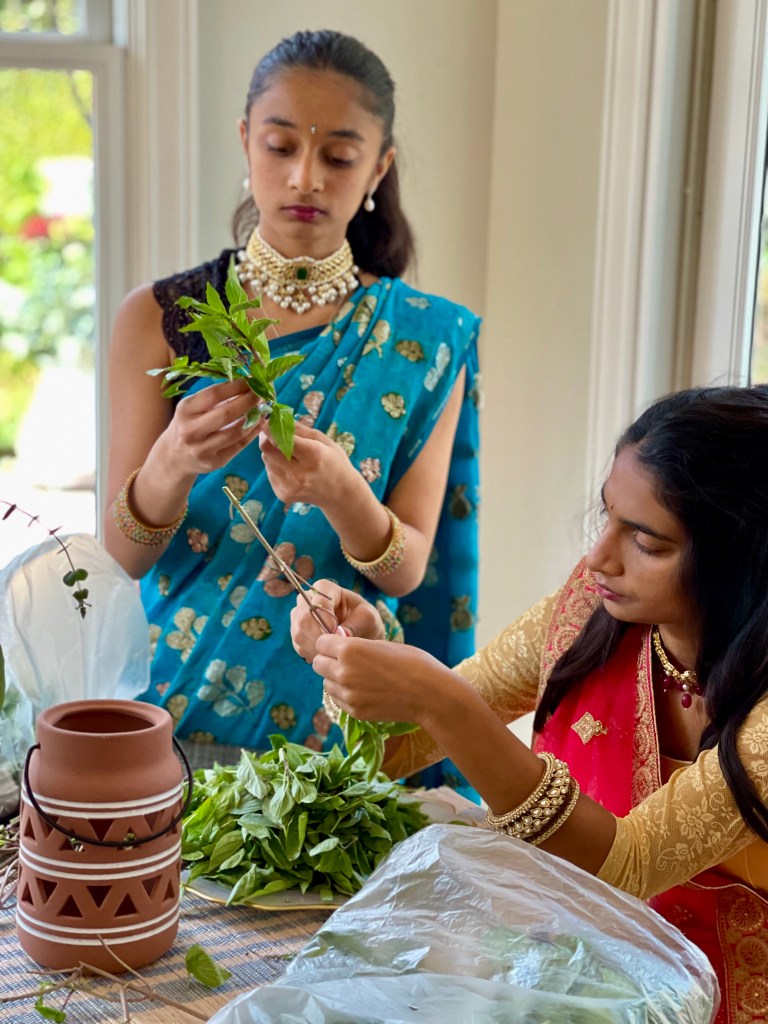 Getting the basil leaves, sheero, and the sandalwood paste ready
