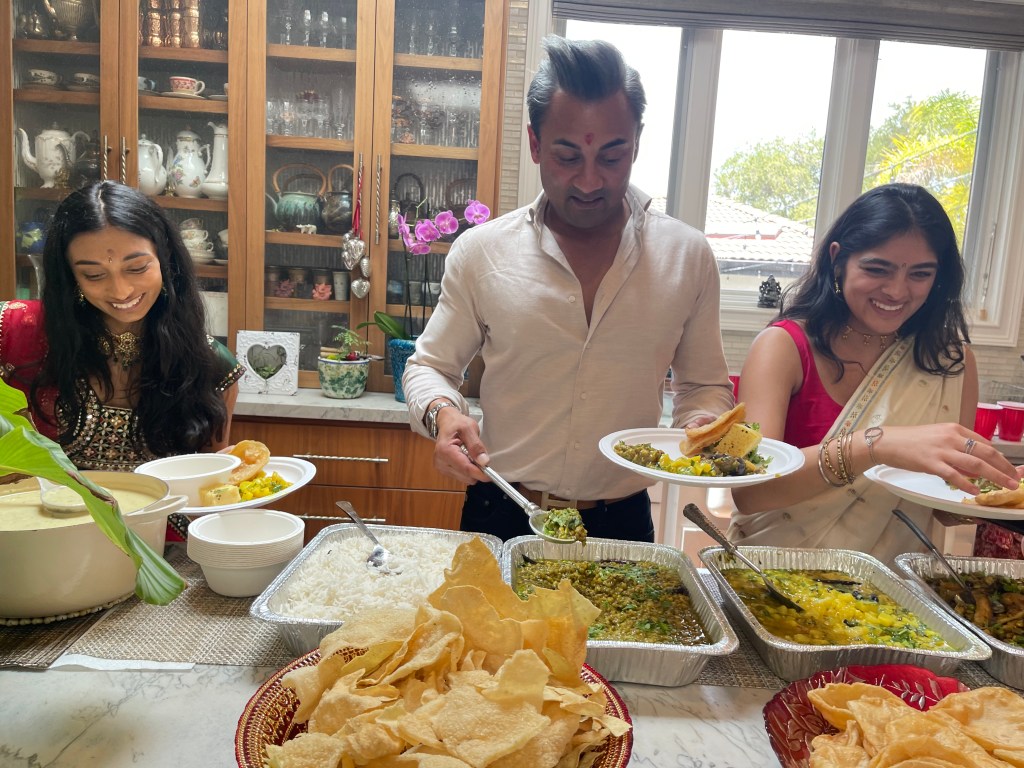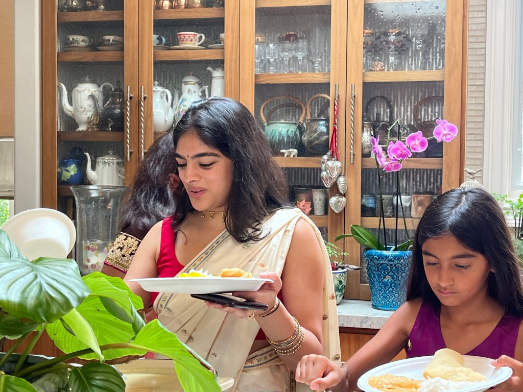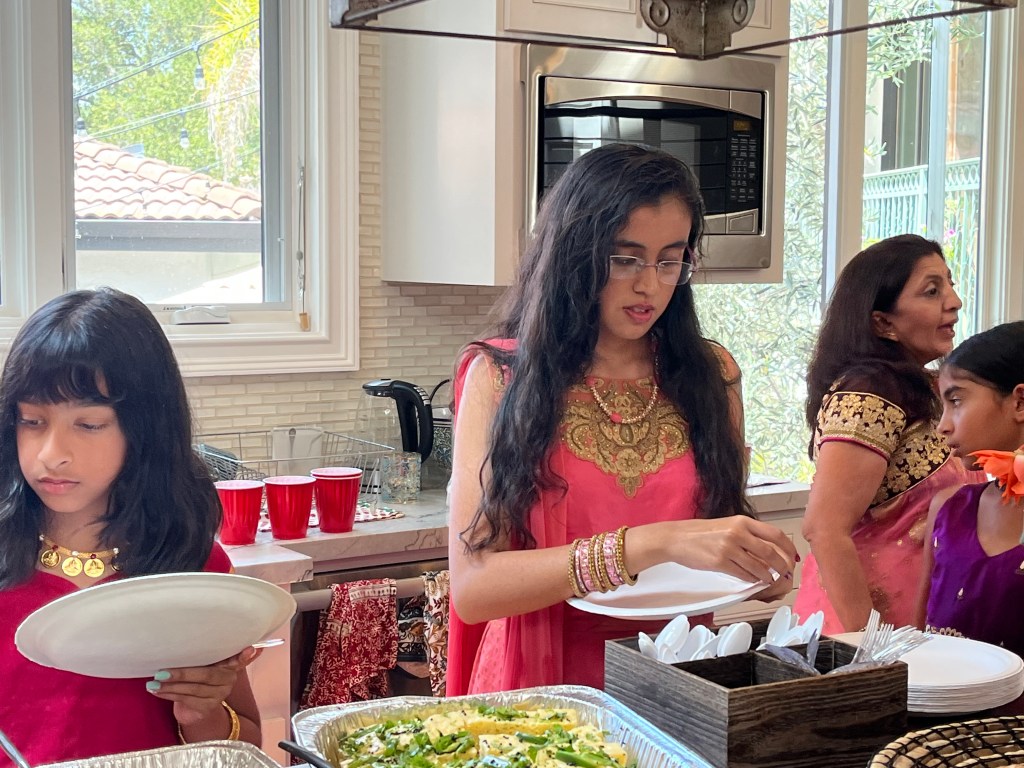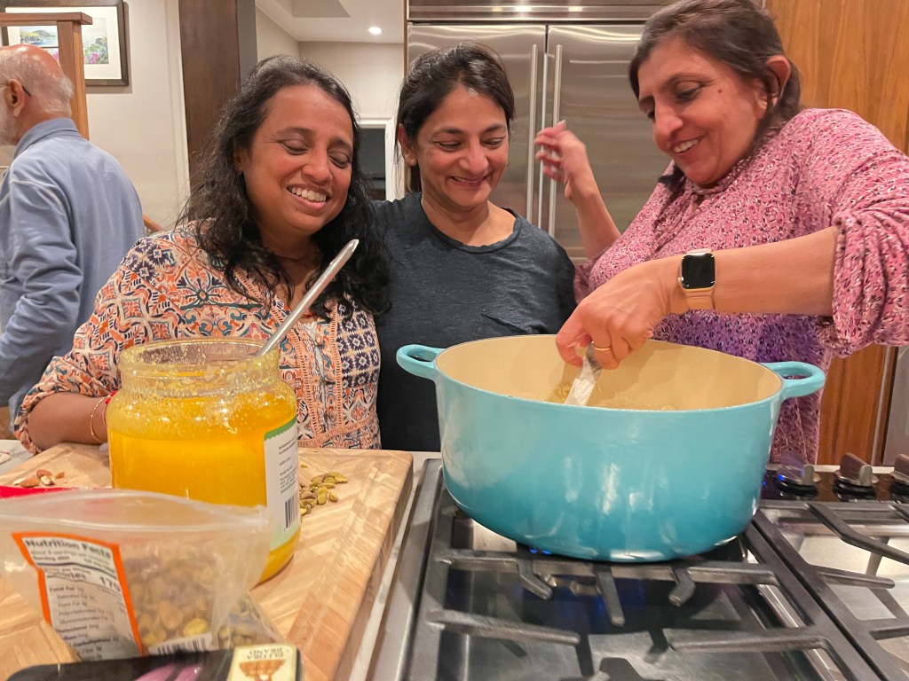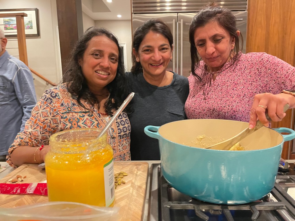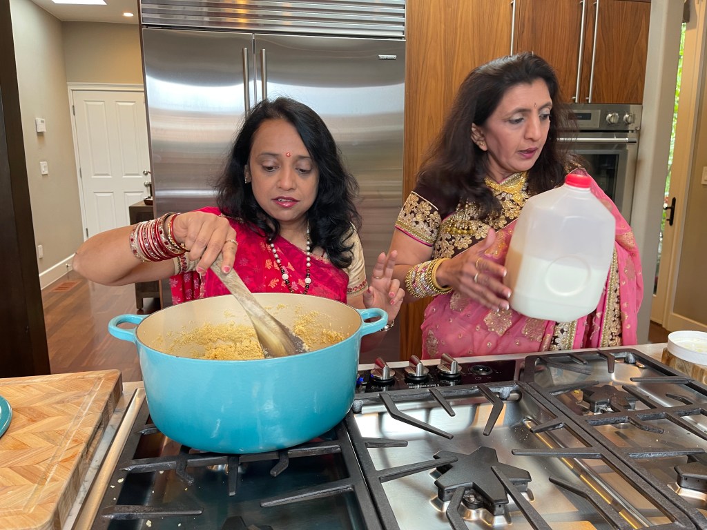Prepping the prasad for the puja with Banu, Deepa and Minal