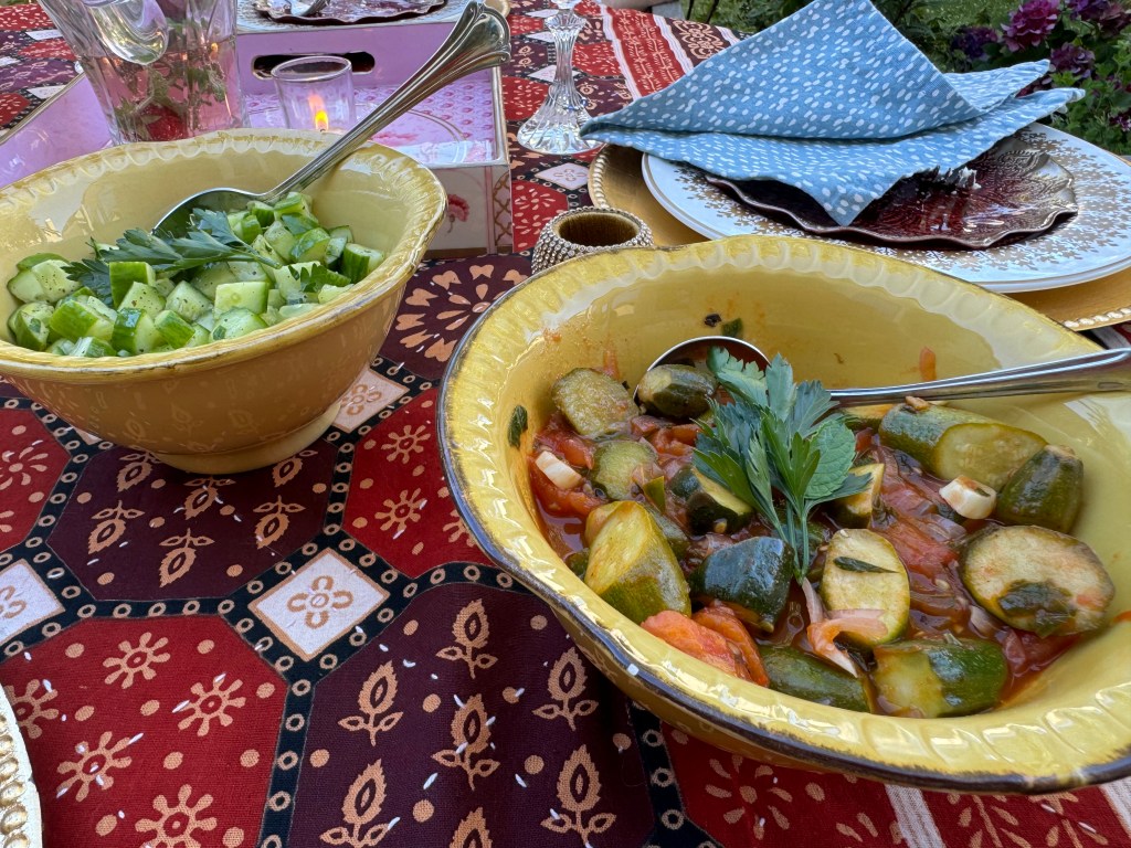 Cheese and crackers, cucumber salad with sumac, baby zucchini and tomato salad, tofu and butternut squash stew with cannellini beans, sage and herbs, and quinoa were on the menu on this beautiful summer evening. All the dishes were vegan and they tasted outstanding! Spritzer and chilled white wine for a celebratory evening.